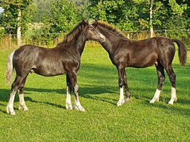 Gentleman blev født kort før midnat på sin mors 15 års fødselsdag. Så kan det da ikke være meget flottere. Ja, det skulle så lige være, at han ved fødslen så ud til at være SORT! Mange sorte heste er musegrå ved fødslen og i den første tid bliver farven lysere. Hen over sommeren har det været svært at vurdere, om han er rigtig sort eller det man vil kalde sortbrun. Men flot, det er han, med fire næsten ens sokker og en fin blis.